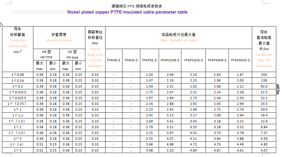 鍍鎳銅芯PTFE絕緣電線參數(shù)表